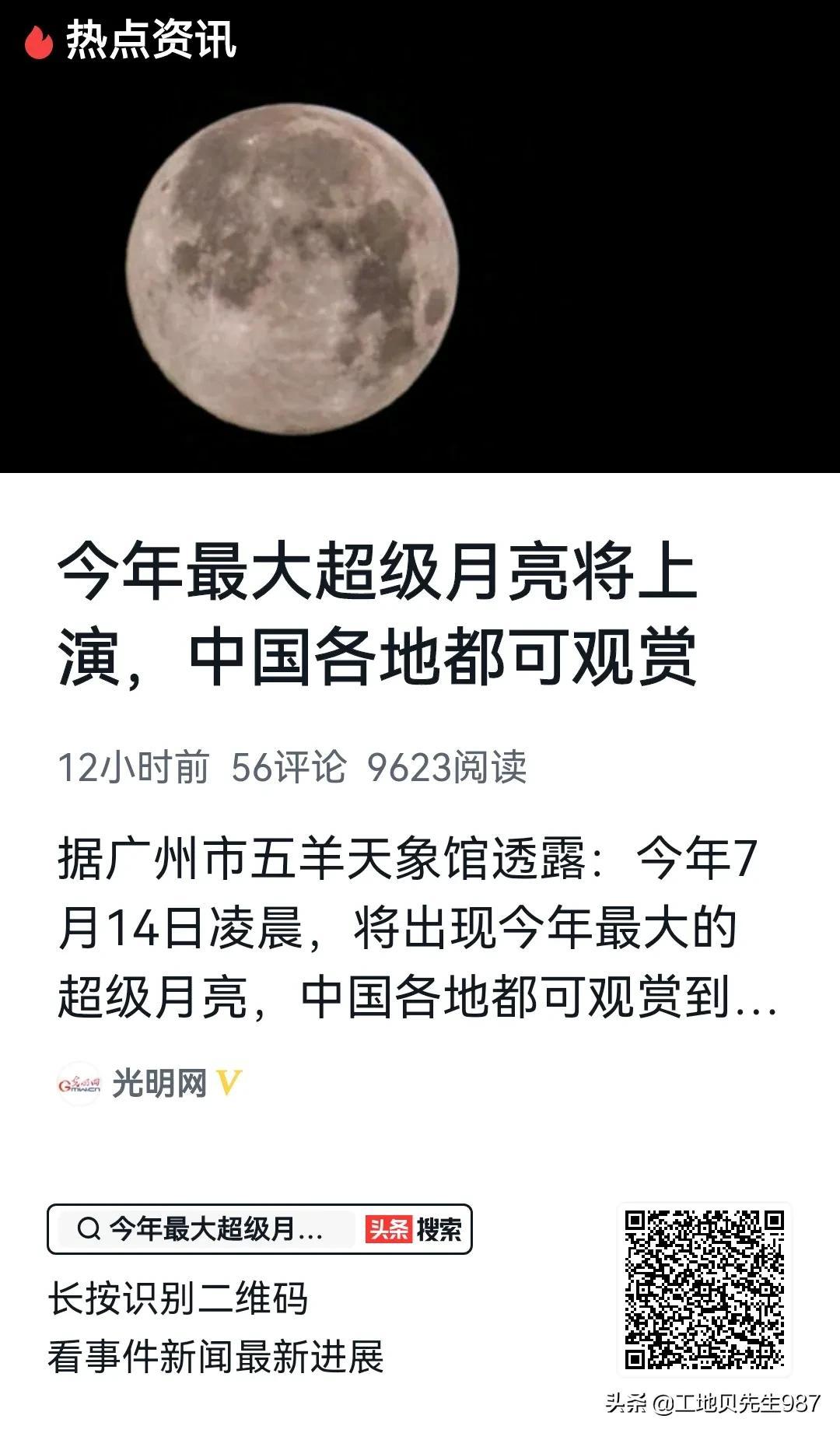 根据光明网7月11日报道,今年最大的一轮超级月亮将于七月十四日清晨降临,中国各地都能看到。最佳观测期为七月十三日晚间到十四日清晨。