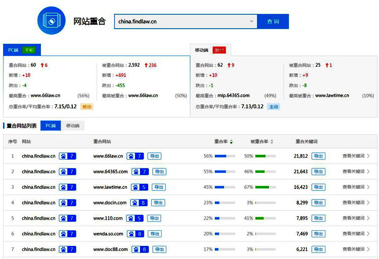 针对网站重合查询,我们可以清晰的看到和自己目标网站高度相关的网站有哪些,行业中一些高权重的站点,同时,其中,一个最为值得关注的点就是重合的关键词词库。