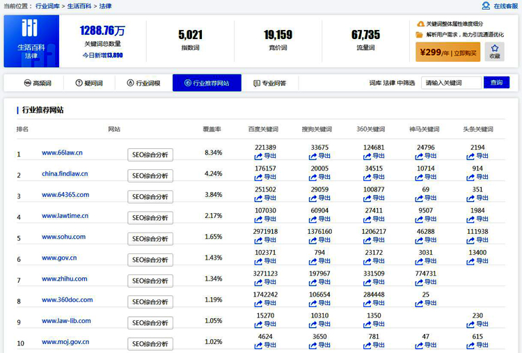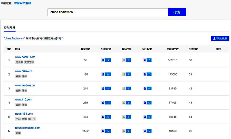 当我们去查看高质量竞争对手网站的时候,我们通常都会事先整理出一些行业中的核心关键词,下面我们以“法律”相关的网站进行举例,比如: