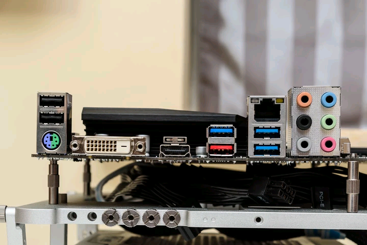 主板后窗接口为2*USB 2.0、1*PS/2、1*DVI-D、1*HDMI、3*USB 3.0、1*USB 3.1、1*LAN、6*音频3.5。总的来说是比较中规中矩,不过USB接口比较少。主板的网卡是INTEL的I219V。音频系统为螃蟹的ALC892芯片+四颗日化的音频电容,没有什么太特别的。