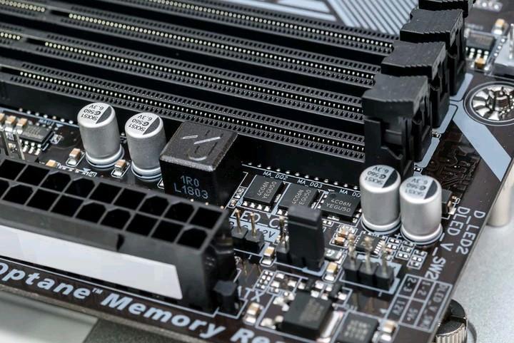 由于B360对内存超频是有限制的,所以内存控制器的规格相对精简与B250类似。各有一颗MOS和一颗固态电容来为VCCSA和VCCIO供电。B360最大可支持四根DDR4内存插槽,最大可以支持16G*4.内存供电部分中规中矩,两颗钰邦固态电容输入,三颗安森美4C06N MOS负责供电,输出为一颗感值1R0的电感和两颗钰邦固态电容。B360的芯片组拆掉散热片就可以看得到,依然是没有印字的版本。外形与200系列基本一致。H370及以下的芯片组都是不支持SLI的,所以主板上多个显卡插槽一般都是16+4的配置。