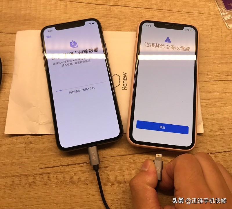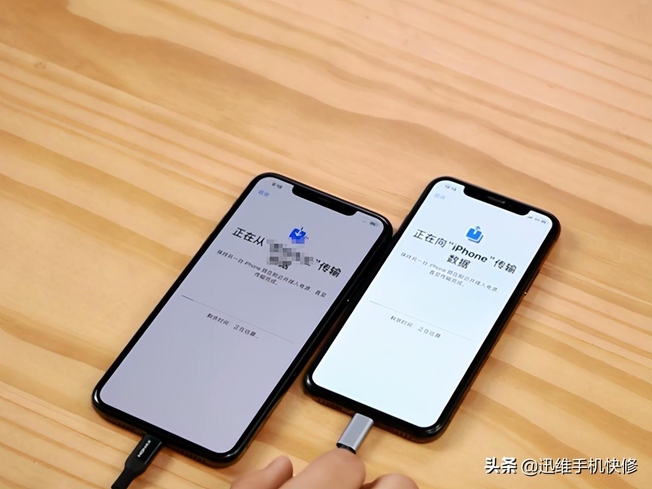 两台iPhone相邻放置,一个是数据出,一个是数据入,直到iPhone数据迁移完成为止。传输时间取决于多个因素手机里的数据大小。